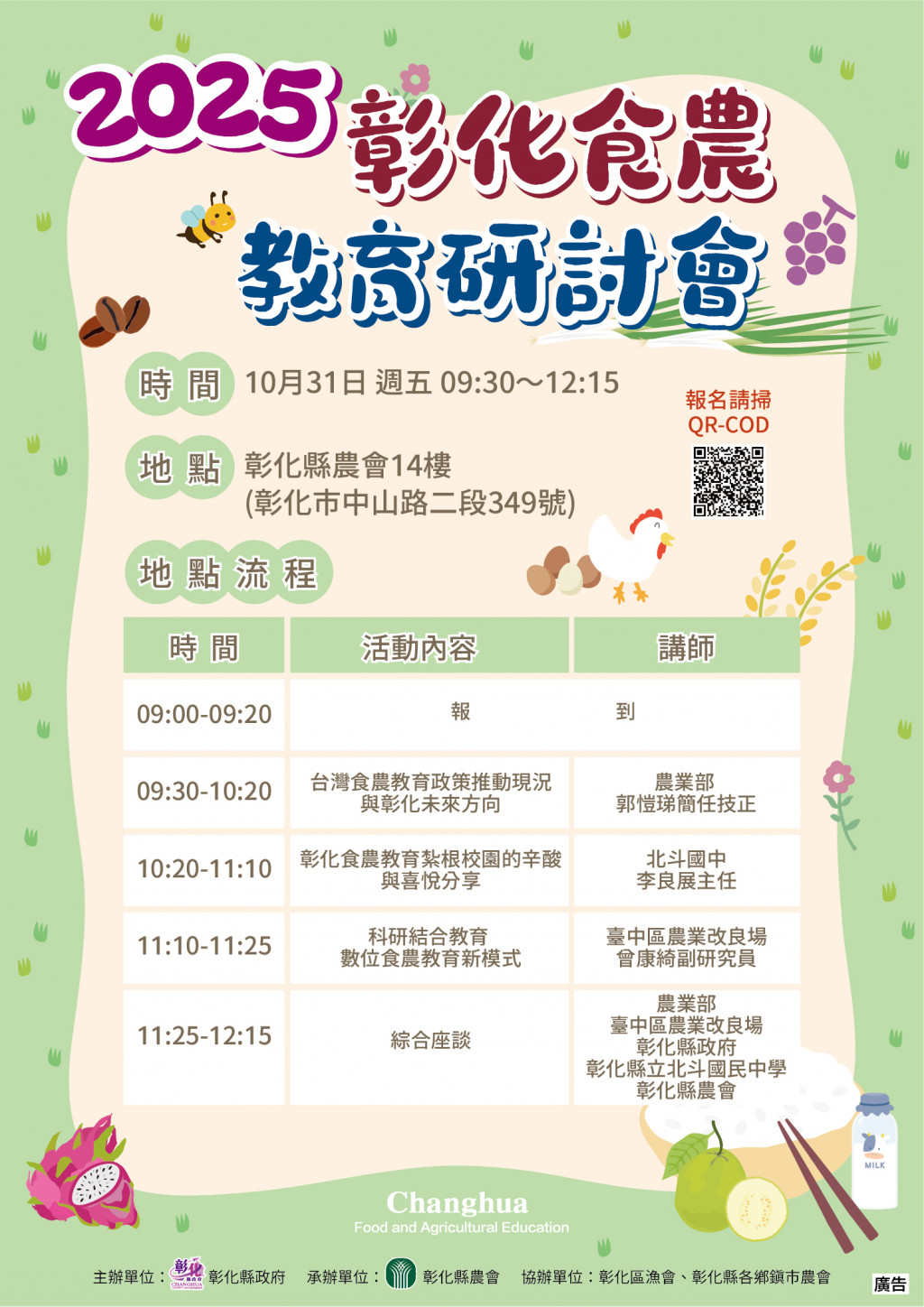 【轉知】10月31日(星期五)上午9時0分假彰化縣農會14樓會議室辦理「2025彰化食農教育研討會」